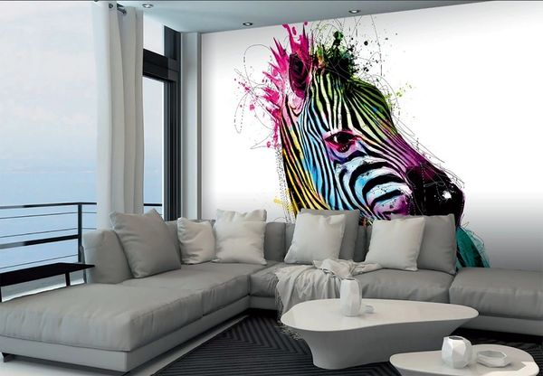 A large close-up shot of the beautiful black and white zebra with a multicoloured splash effect giving it a fantastic unique finish. The multicoloured colours that are a prominent feature in this mural