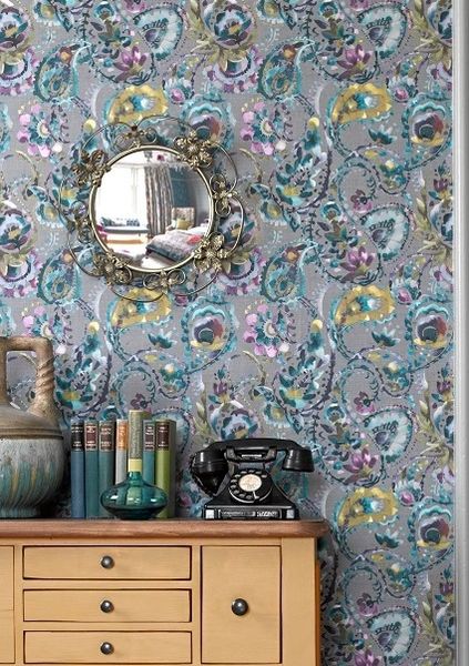 Raya wallpaper is a beautiful representation of paisley styled peacock feathers with lovely muted backgrounds